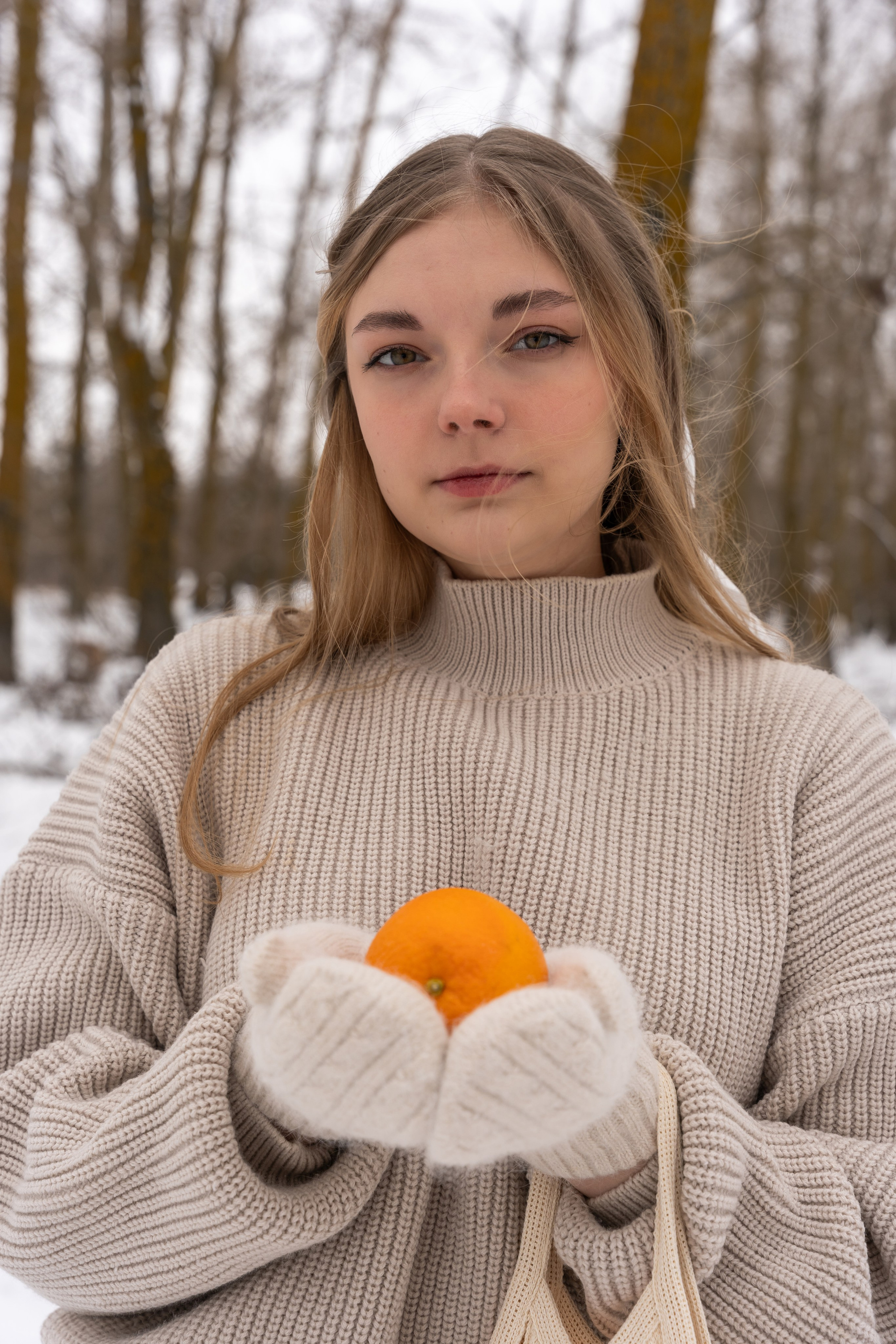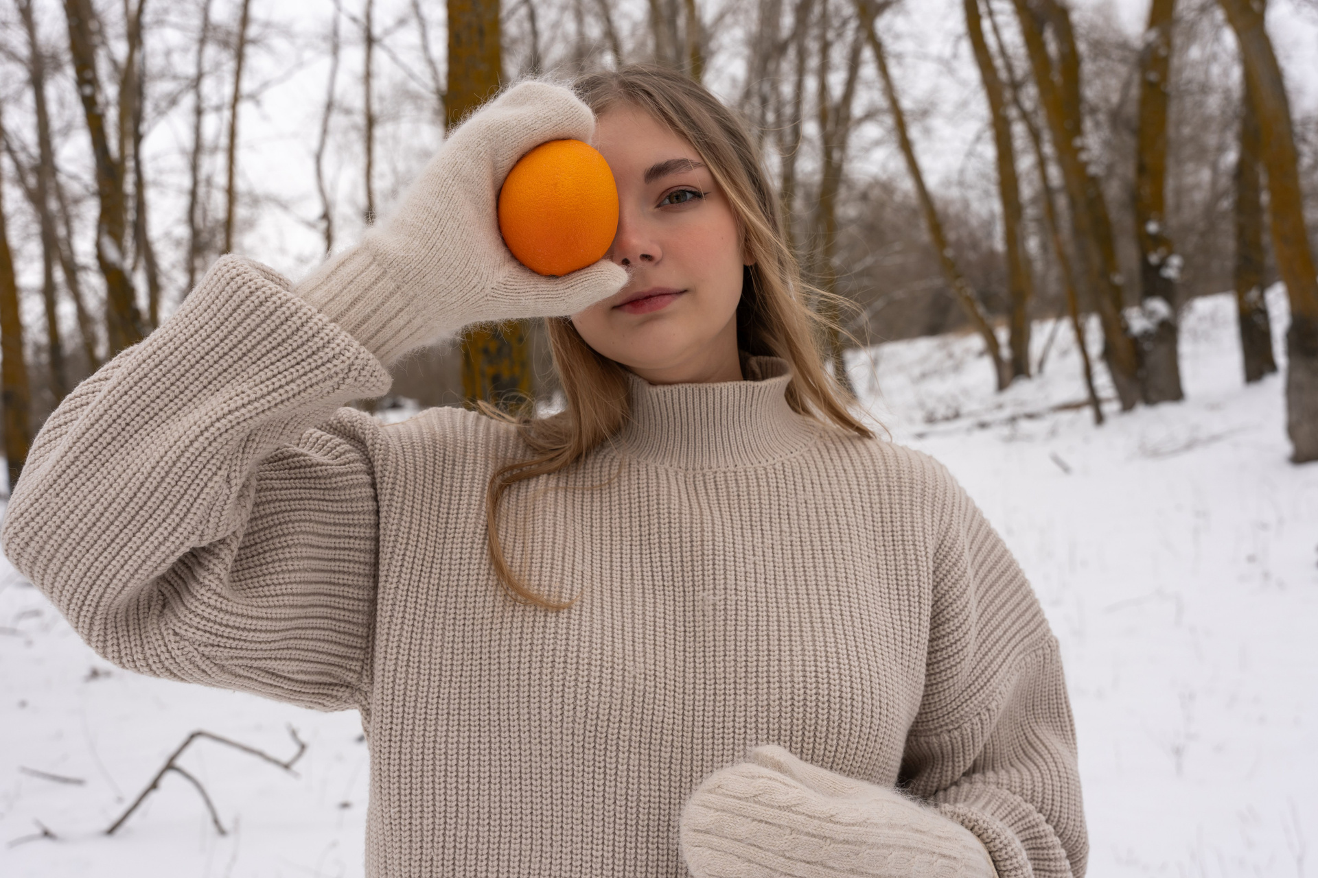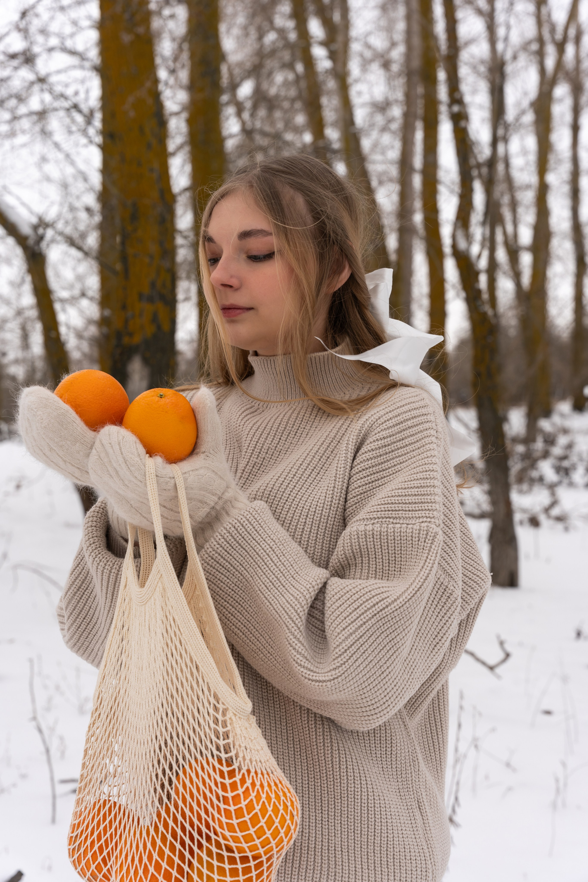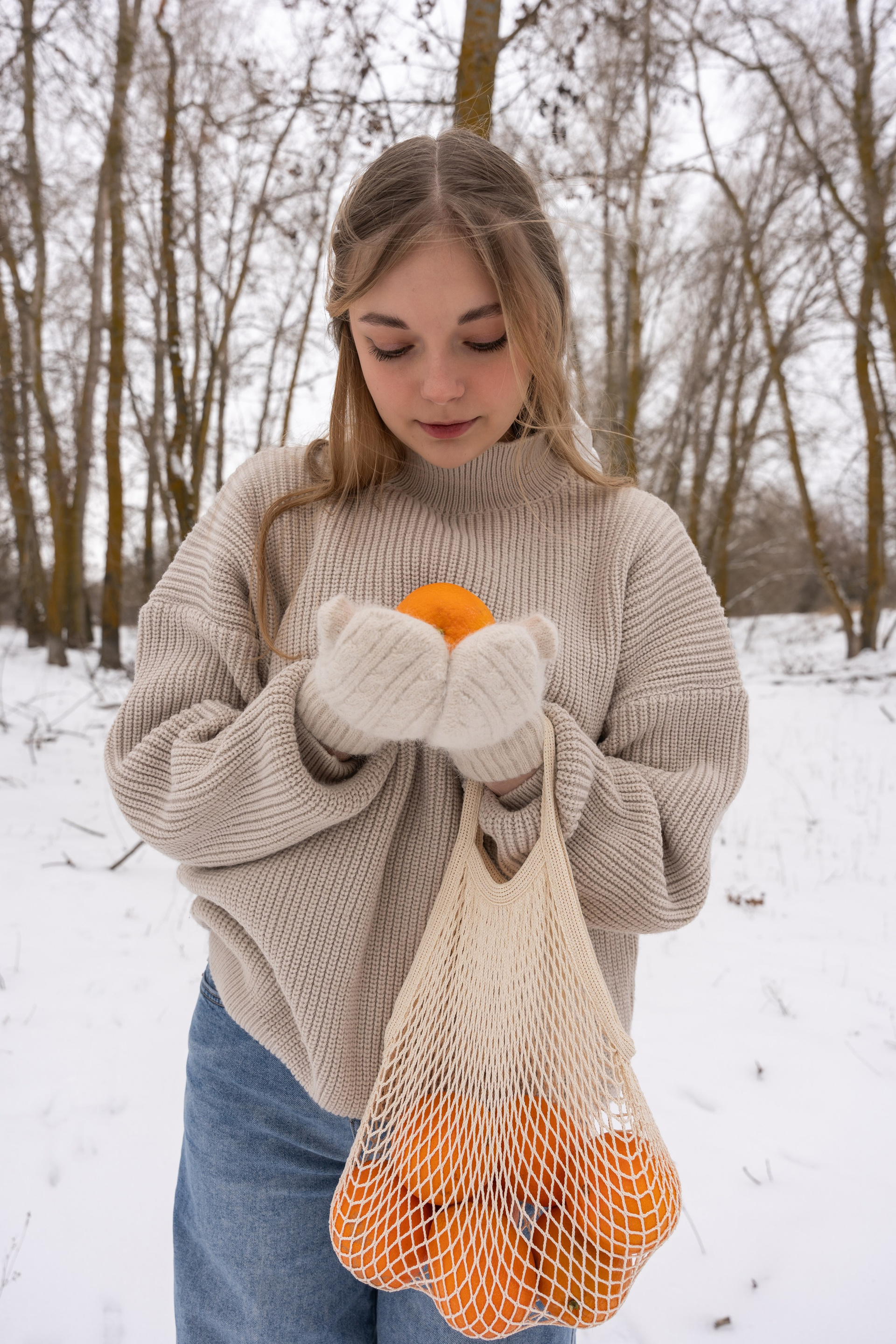 апельсины в руках и варежки добавили цвет и ощущение домашнего тепла даже на