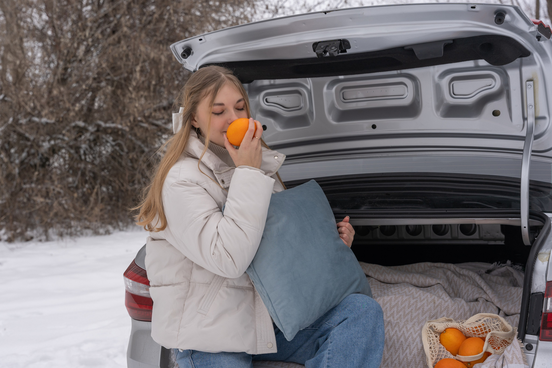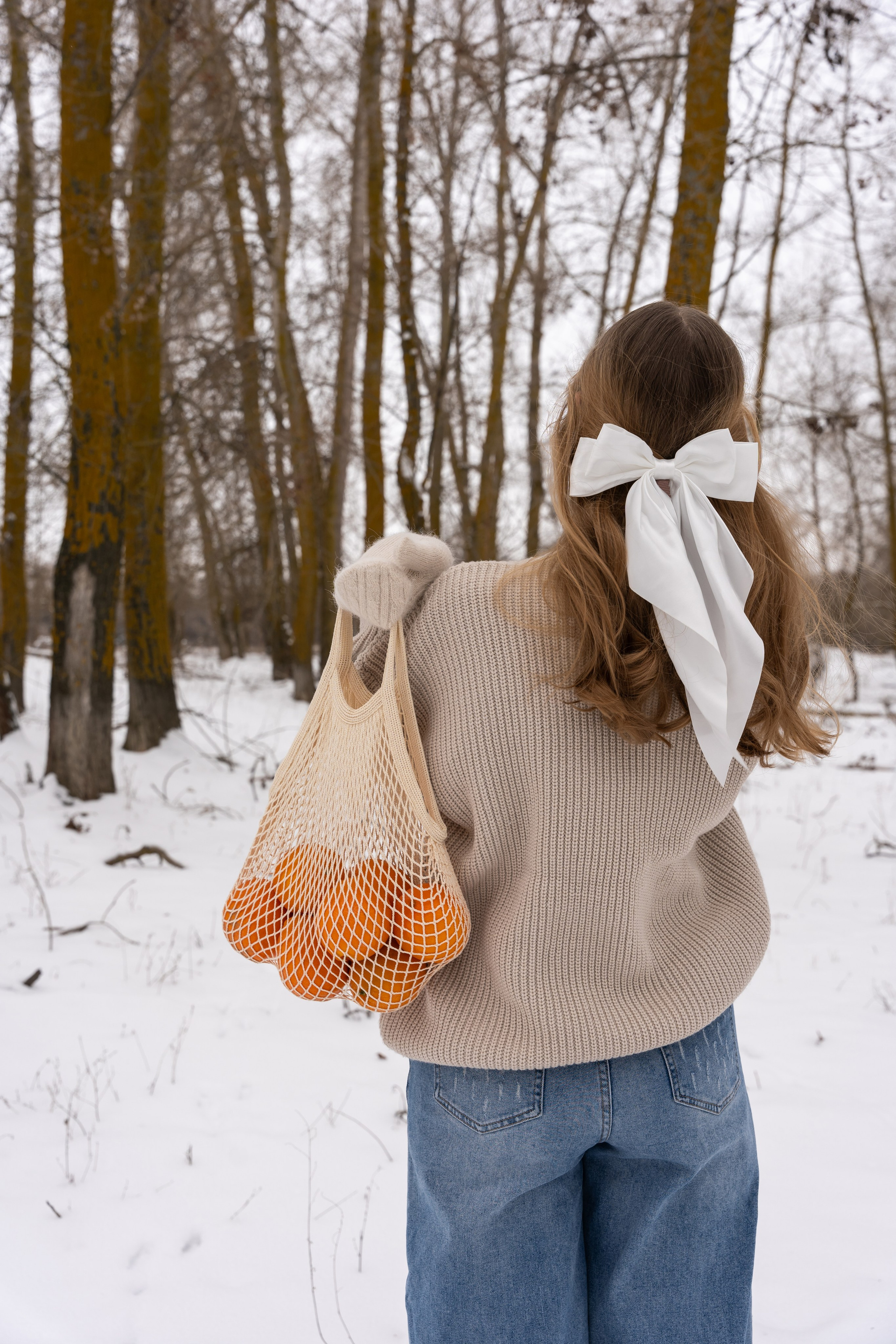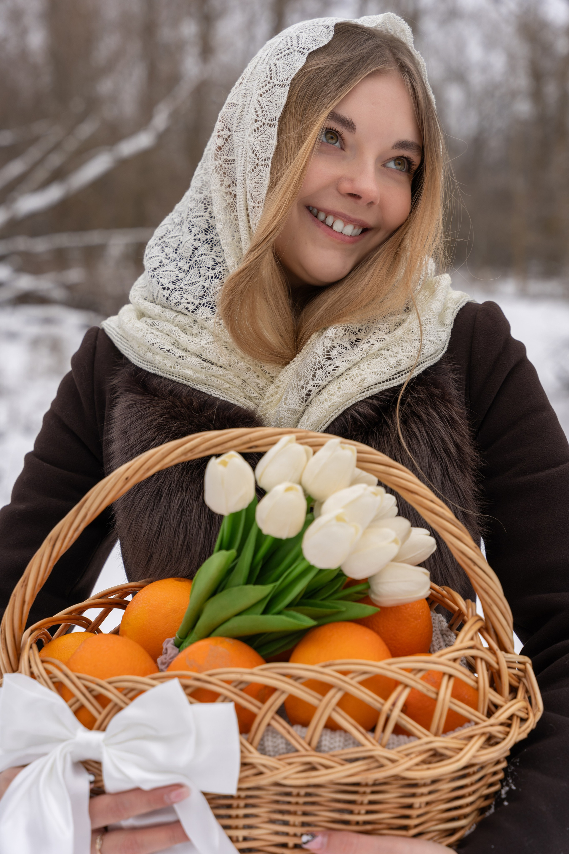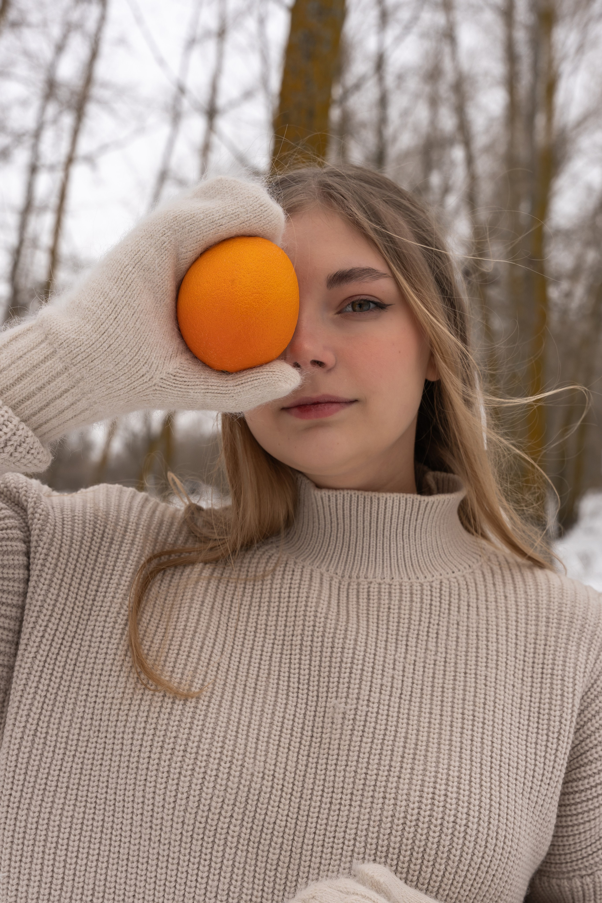 апельсины в руках и варежки добавили цвет и ощущение домашнего тепла даже на