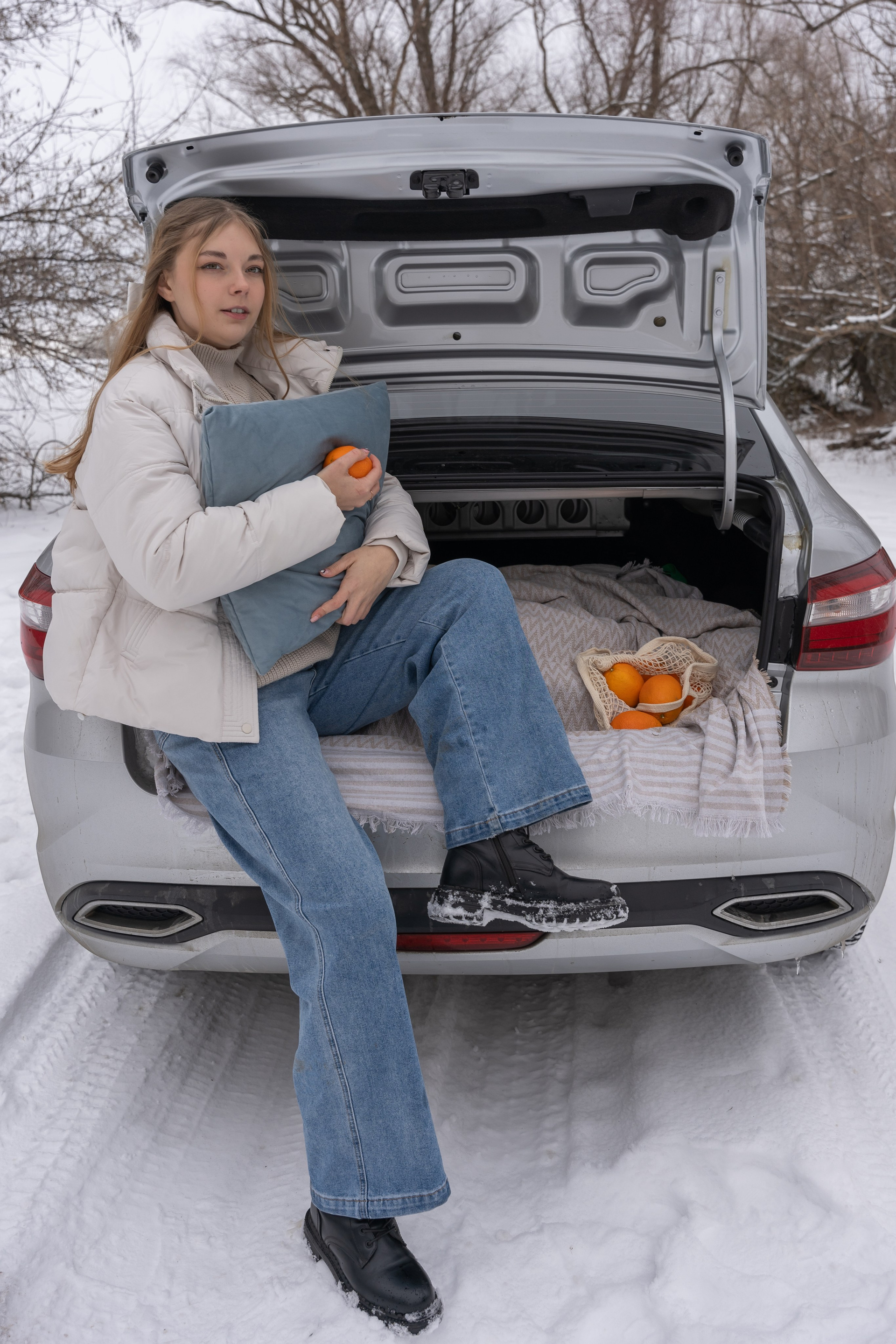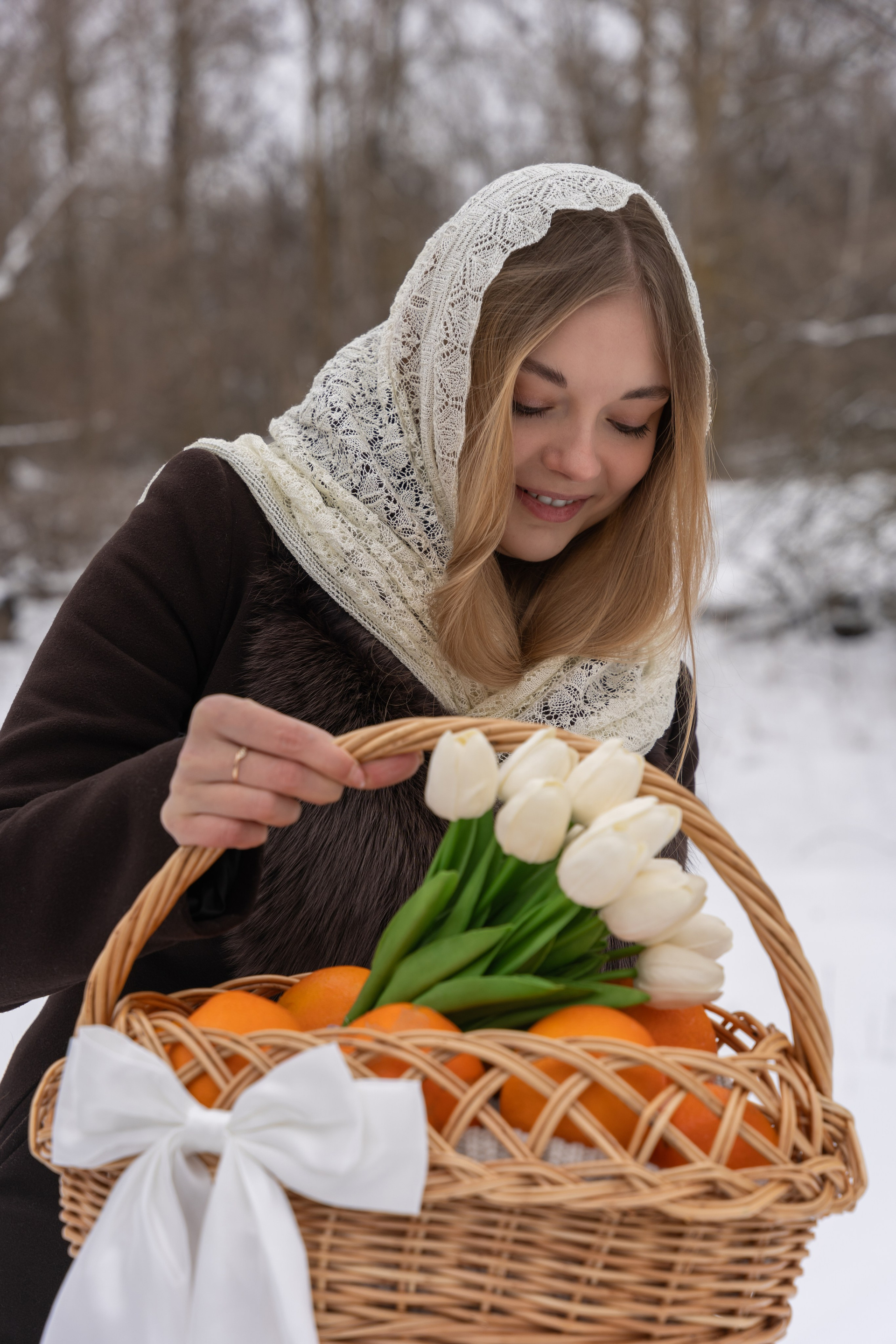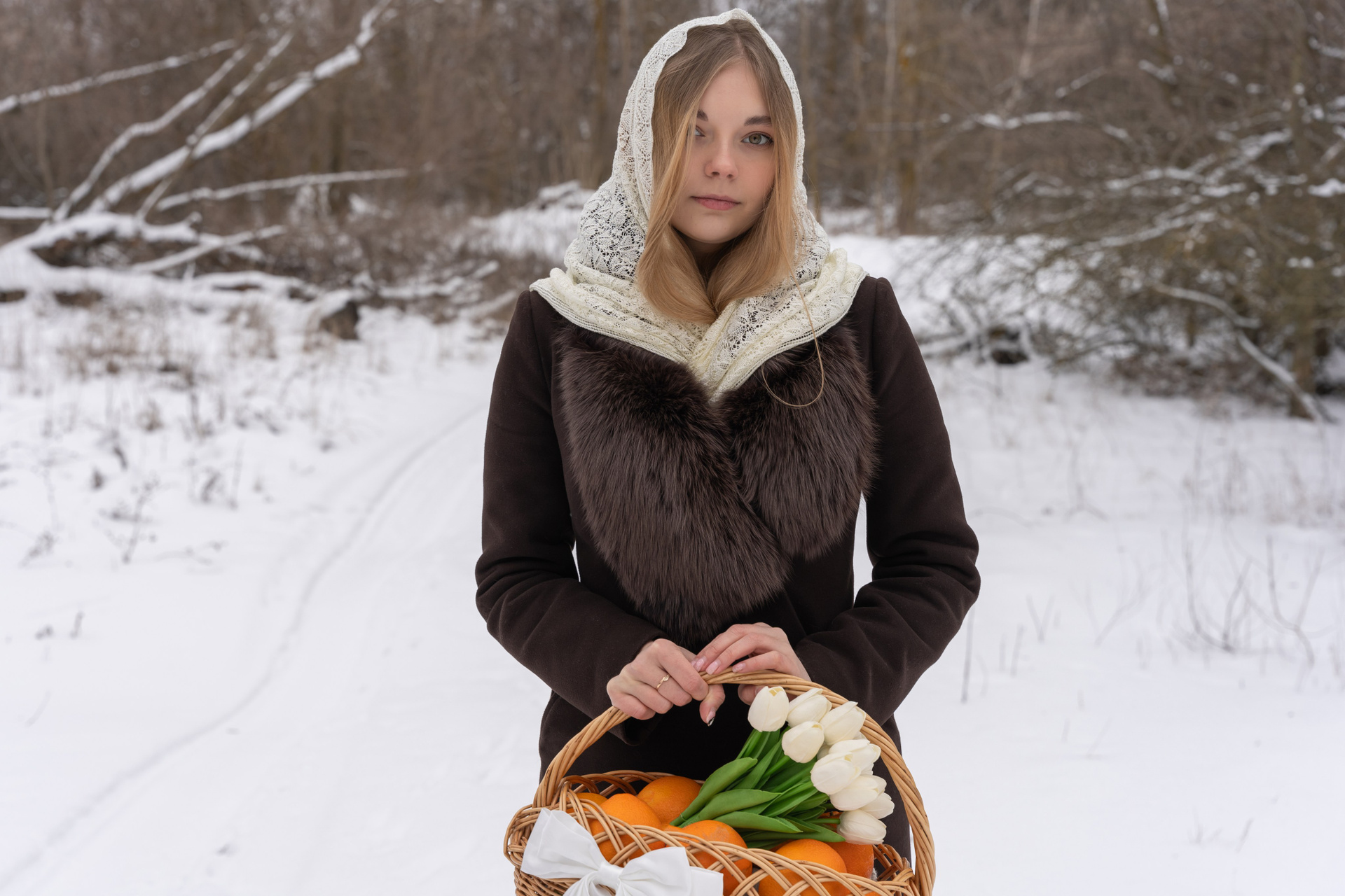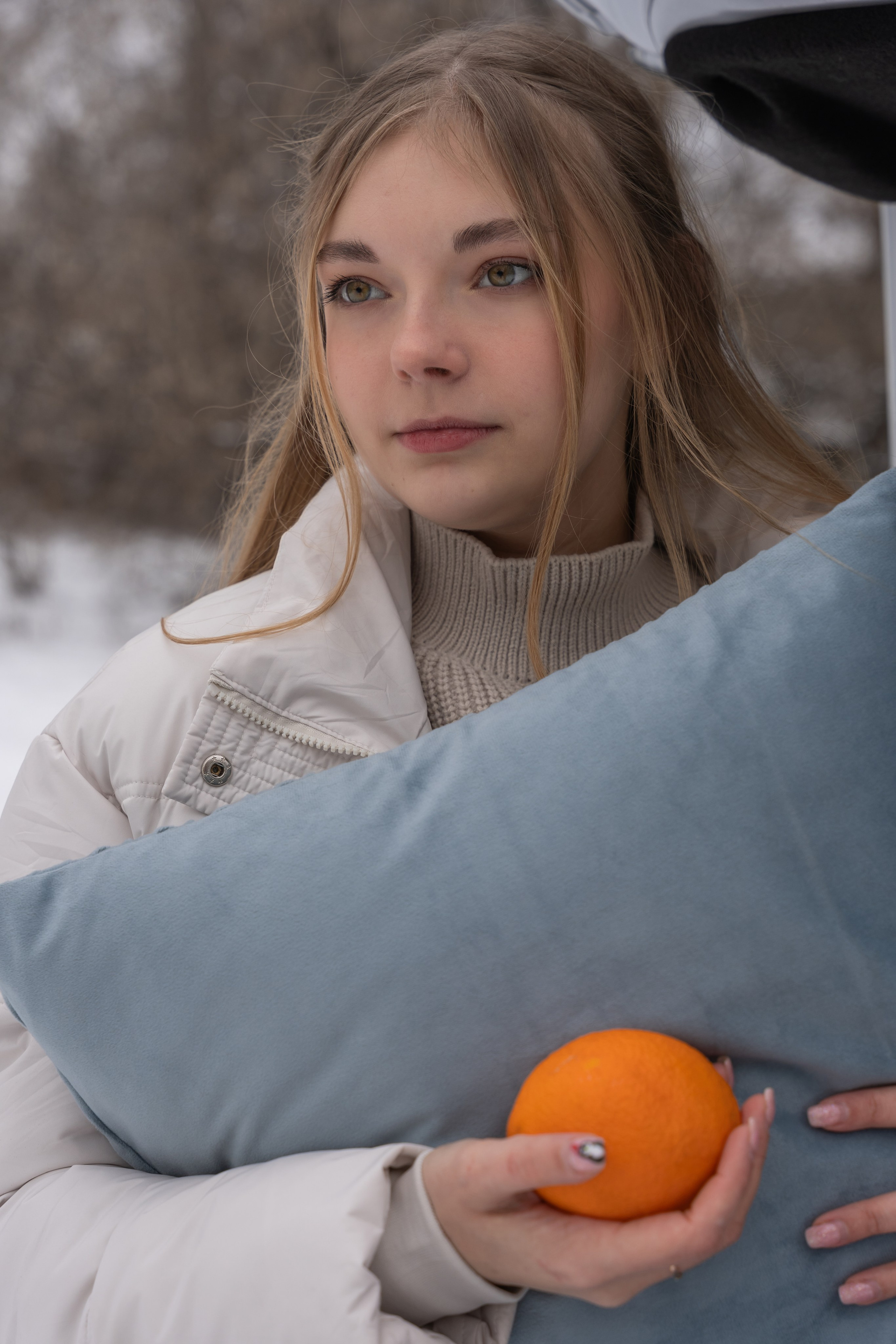 апельсины в руках и варежки добавили цвет и ощущение домашнего тепла даже на