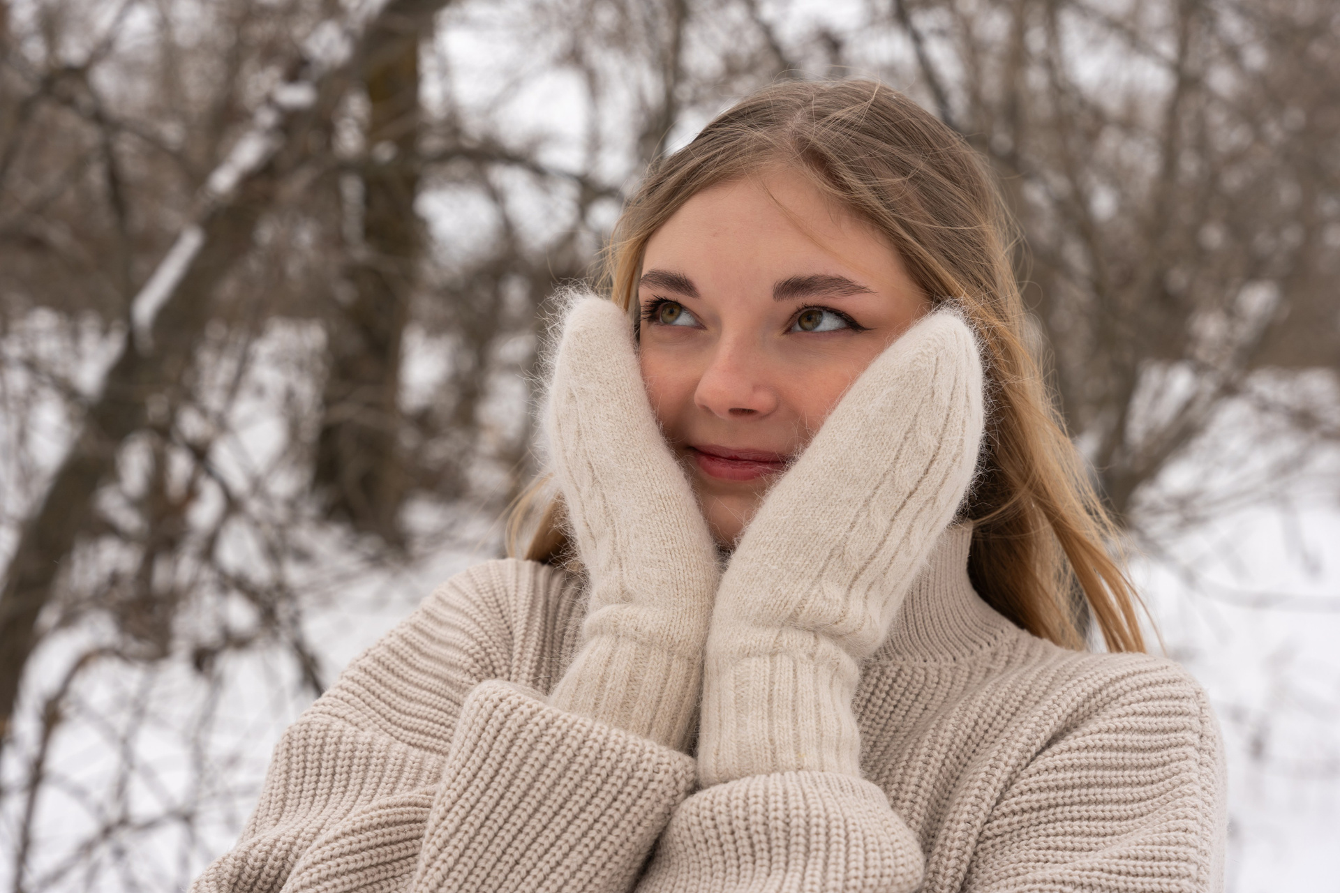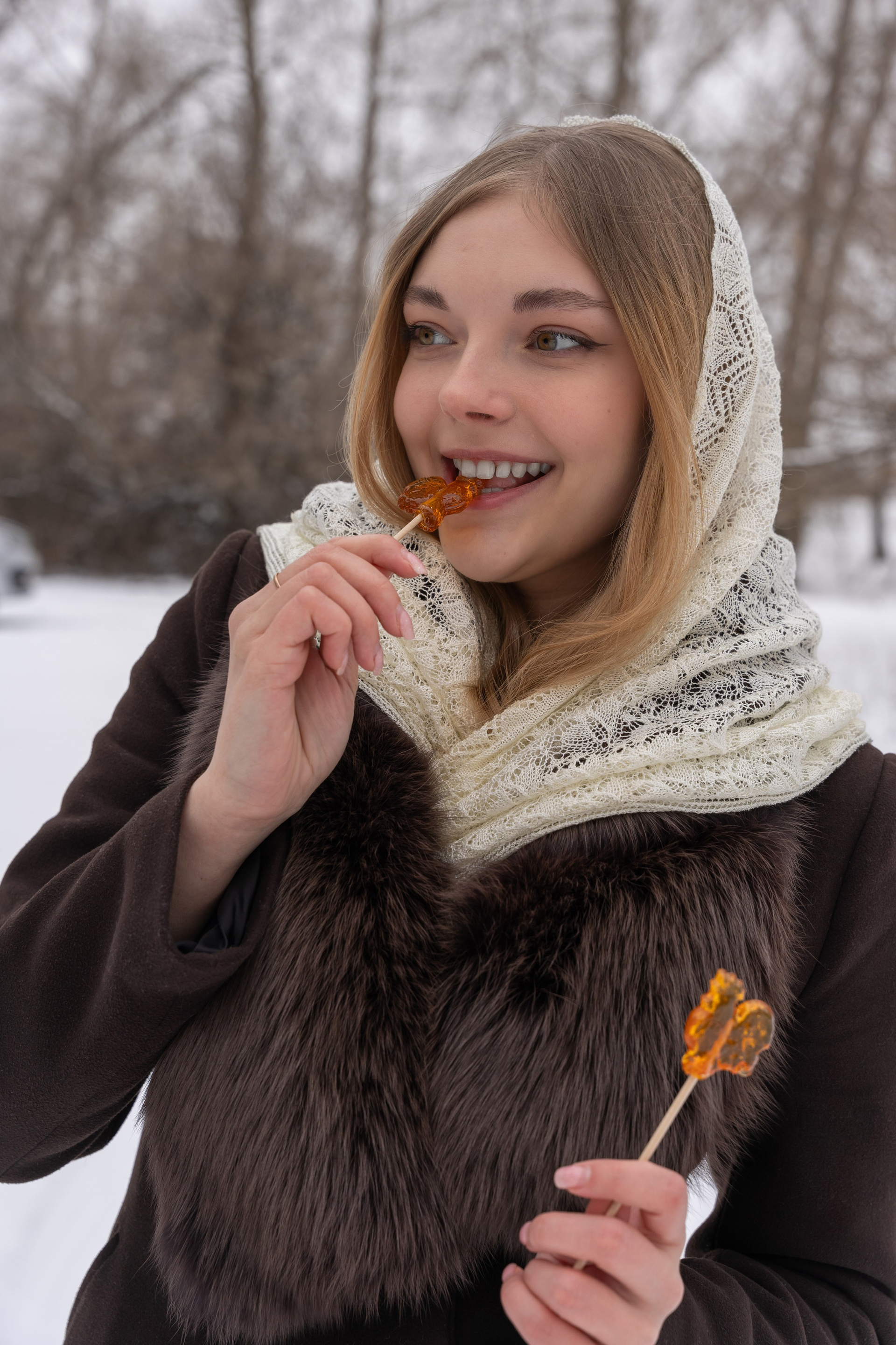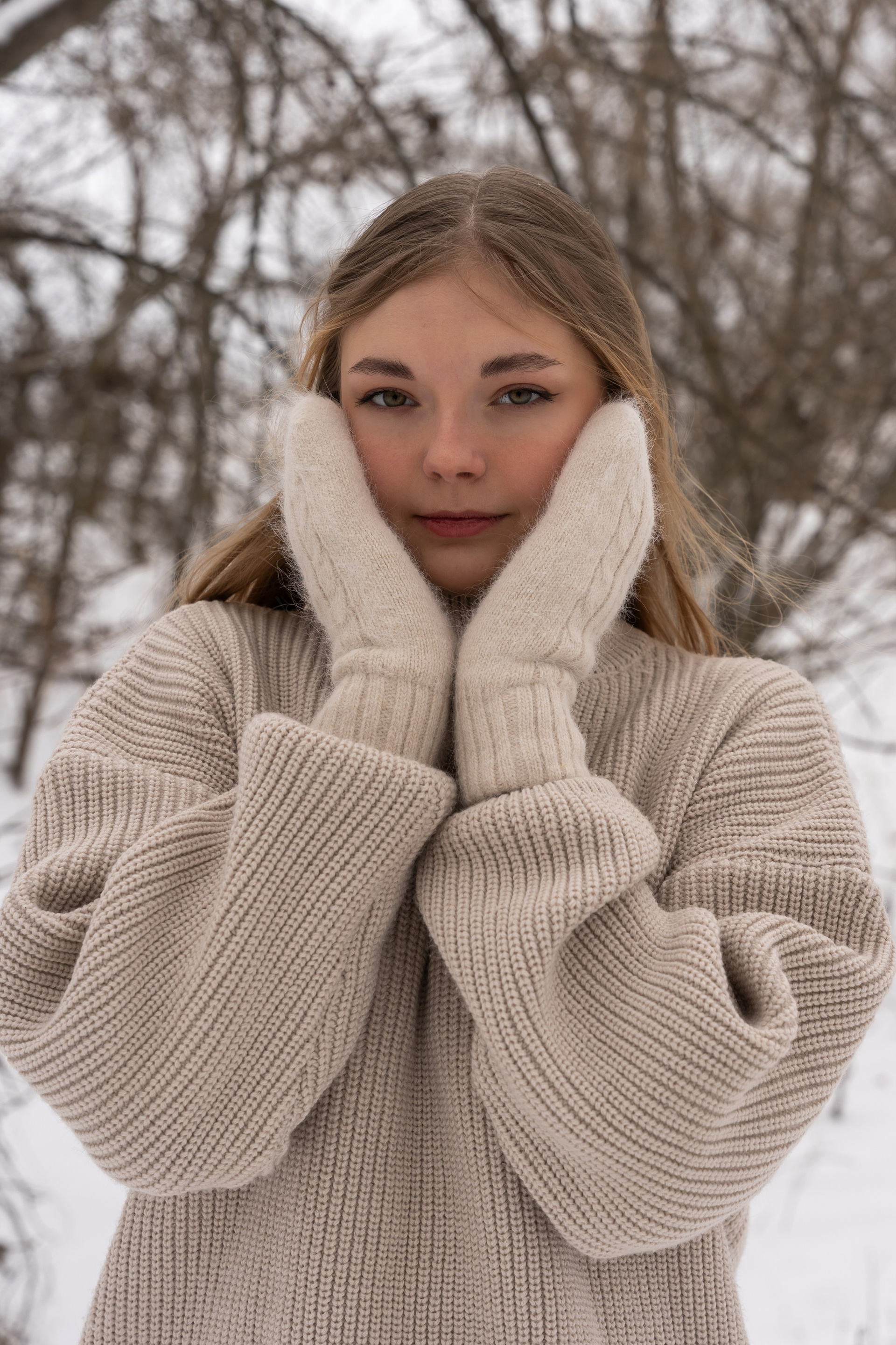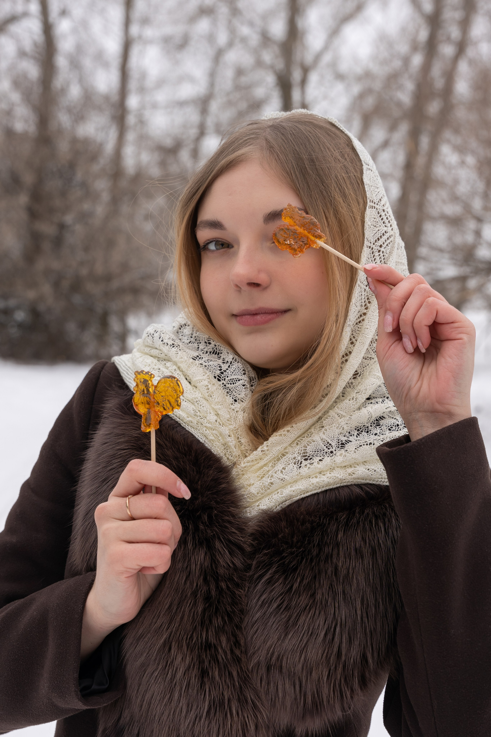 апельсины в руках и варежки добавили цвет и ощущение домашнего тепла даже на