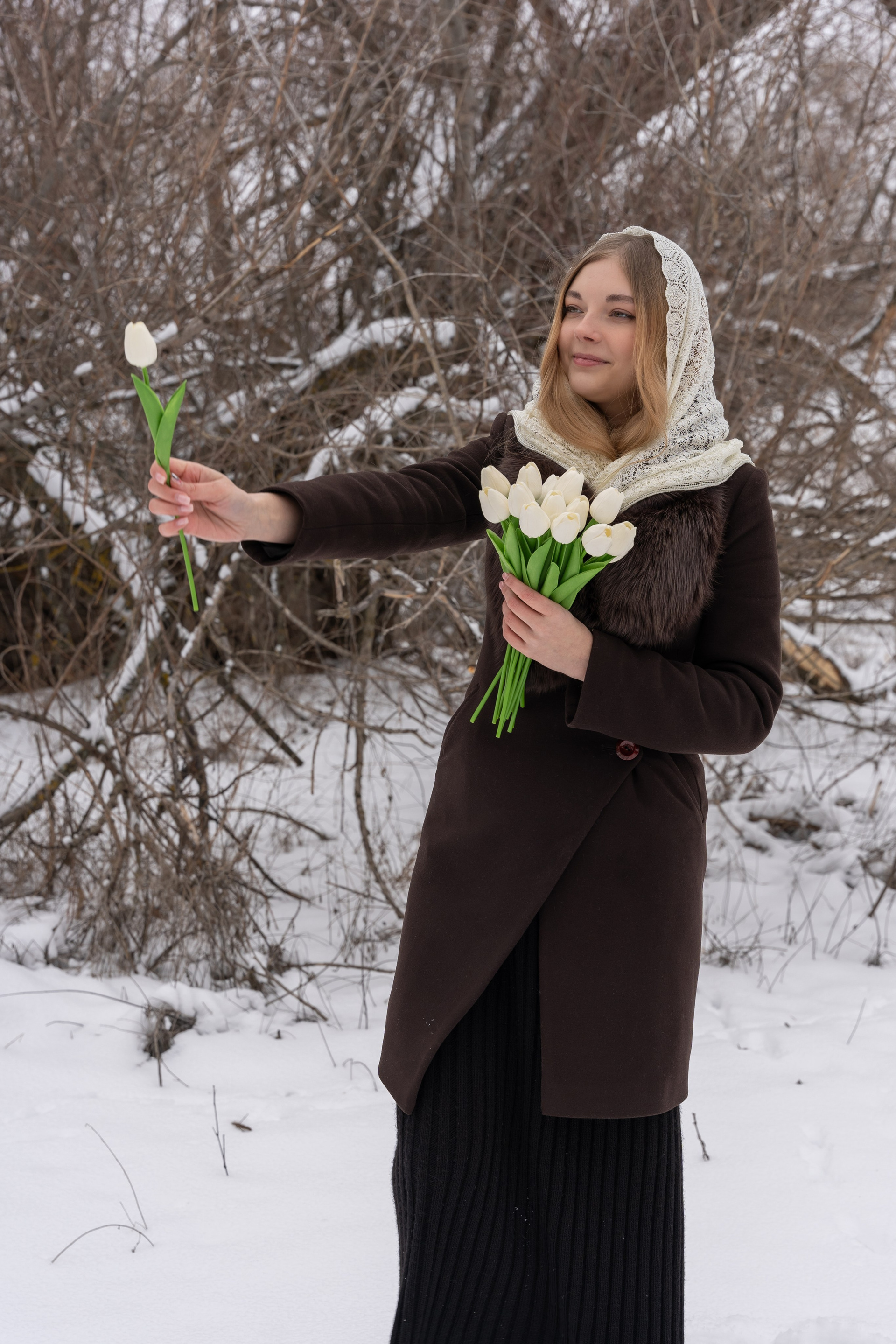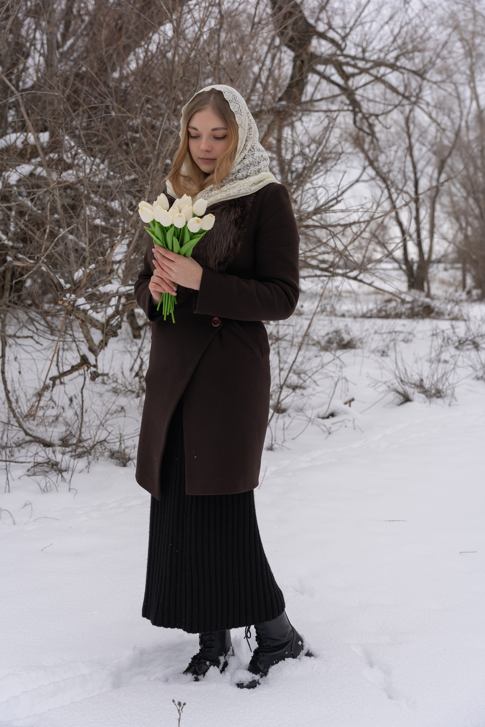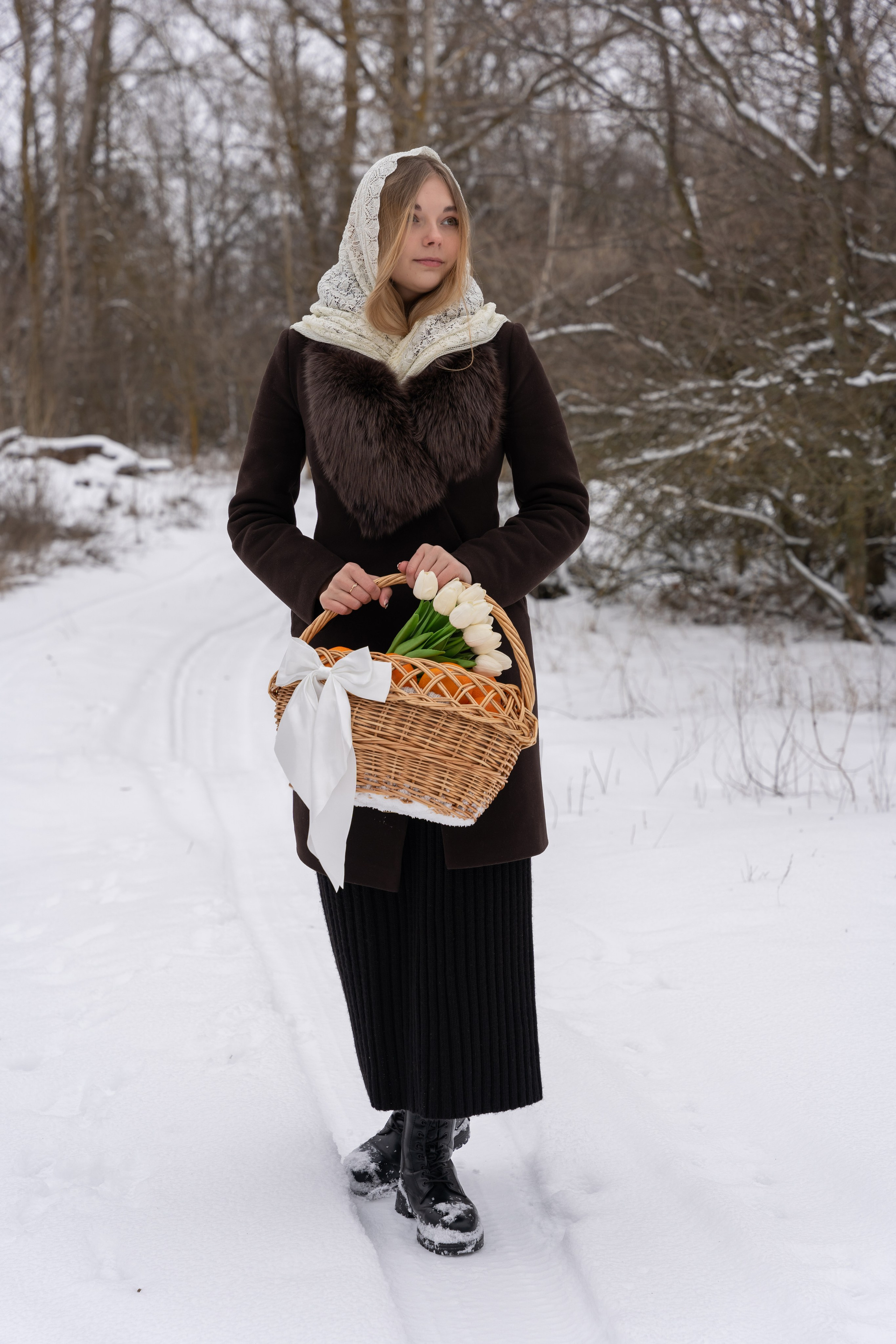пальто и корзина с тюльпанами сделали историю мягче и романтичнее.