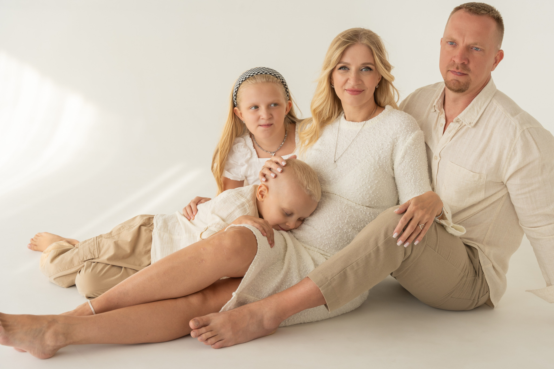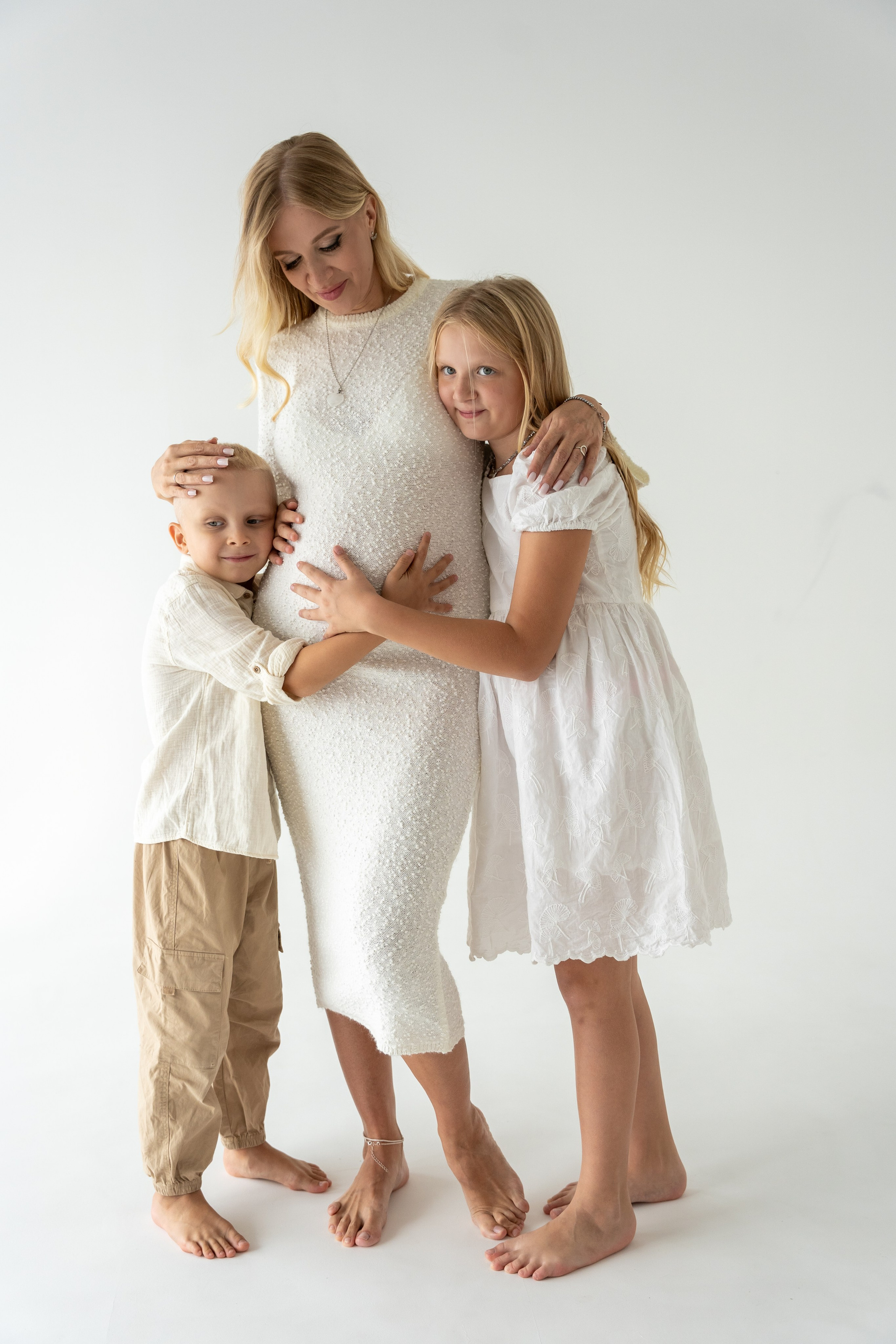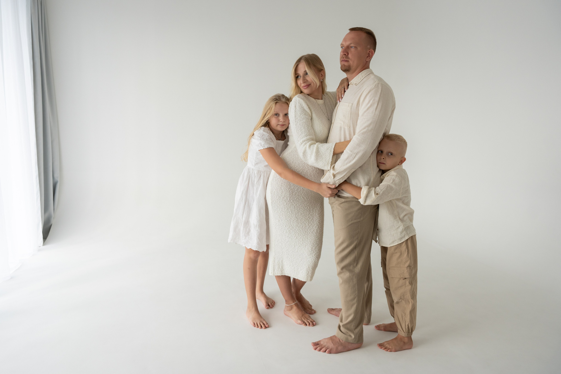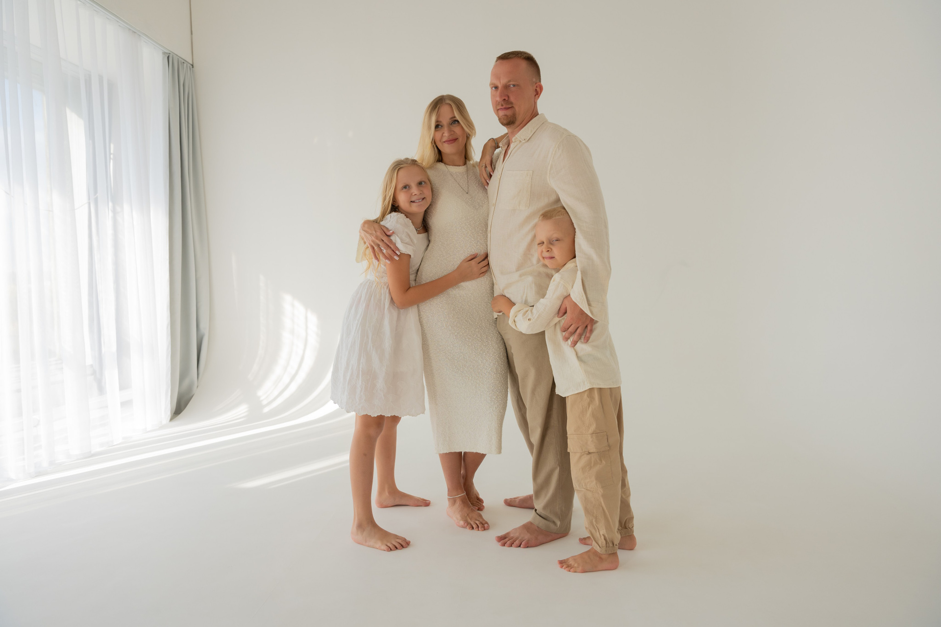 В светлой студии состоялась теплая семейная фотосессия. Царила атмосфера простоты и уюта, где было легко и спокойно. Мама, ожидающая третьего малыша, сияла тихой радостью и внутренним теплом. Папа бережно поддерживал семью своей заботой и мягкой уверенностью. Дочка и младший сын наполнили кадр детским любопытством и искренними улыбками. Каждое прикосновение и взгляд рассказывали о любви и близости. Съемка получилась светлой, нежной и по‑настоящему домашней. Эти фотографии навсегда сохранят моменты ожидания, единства и счастья их растущей семьи.