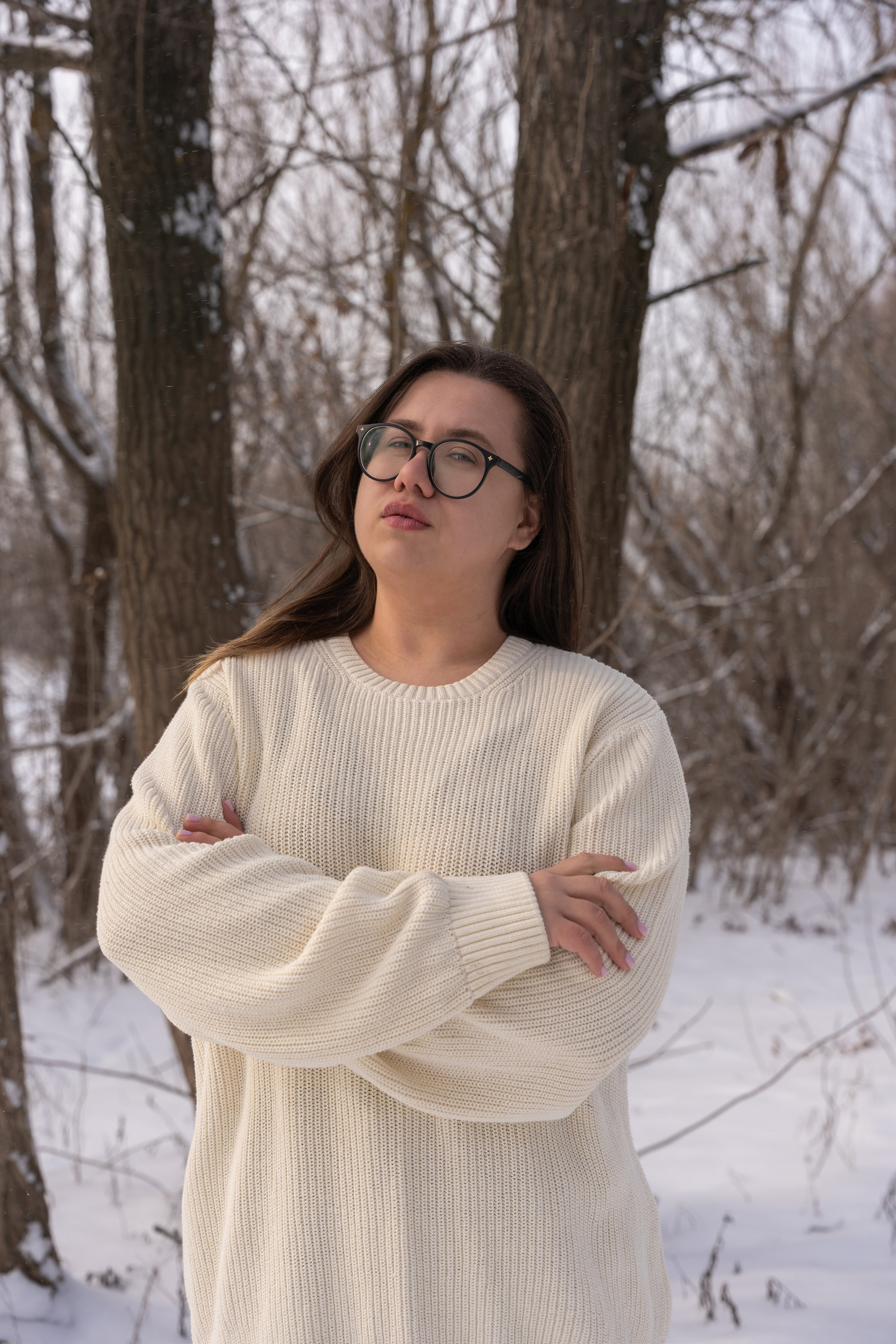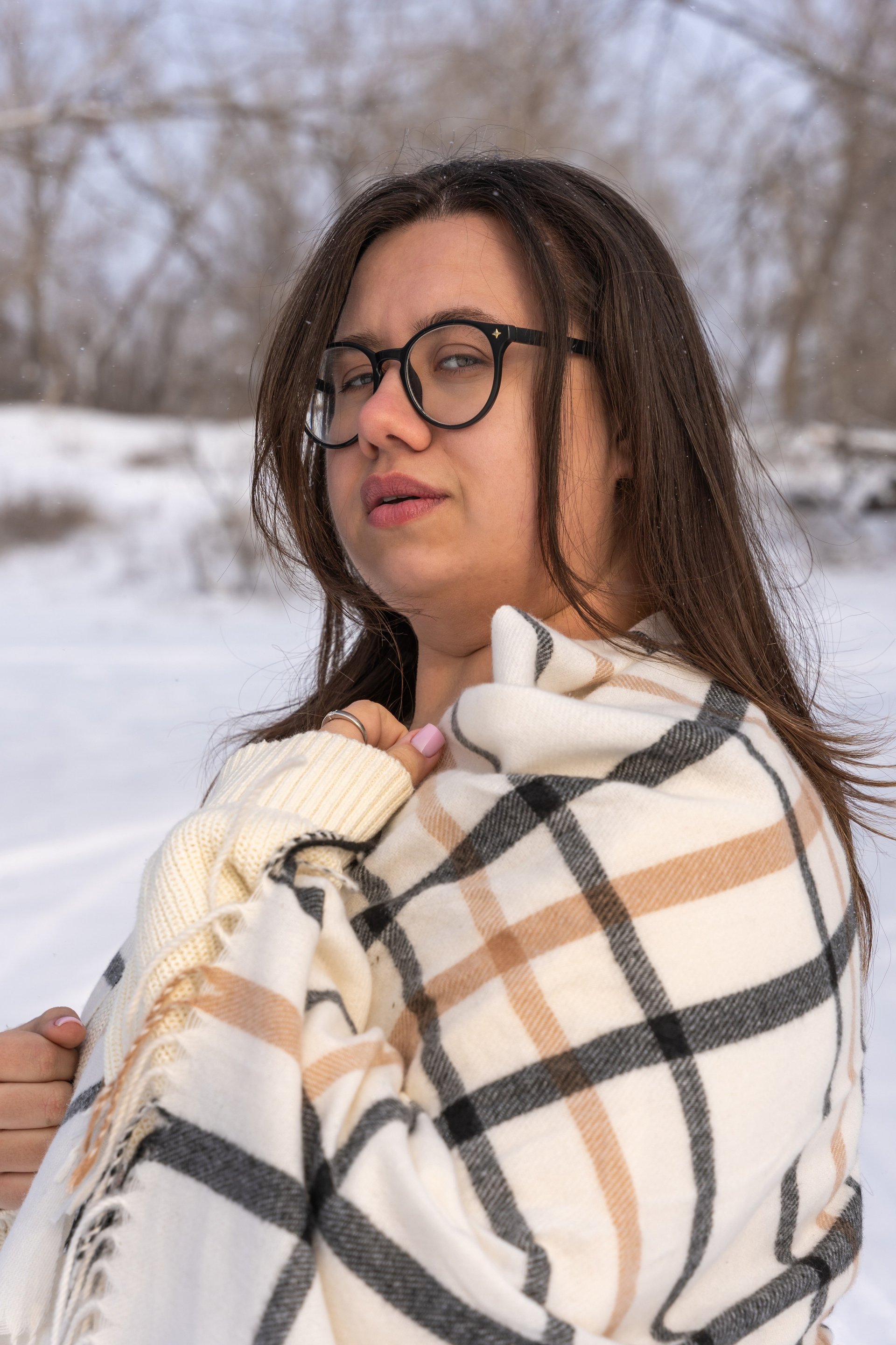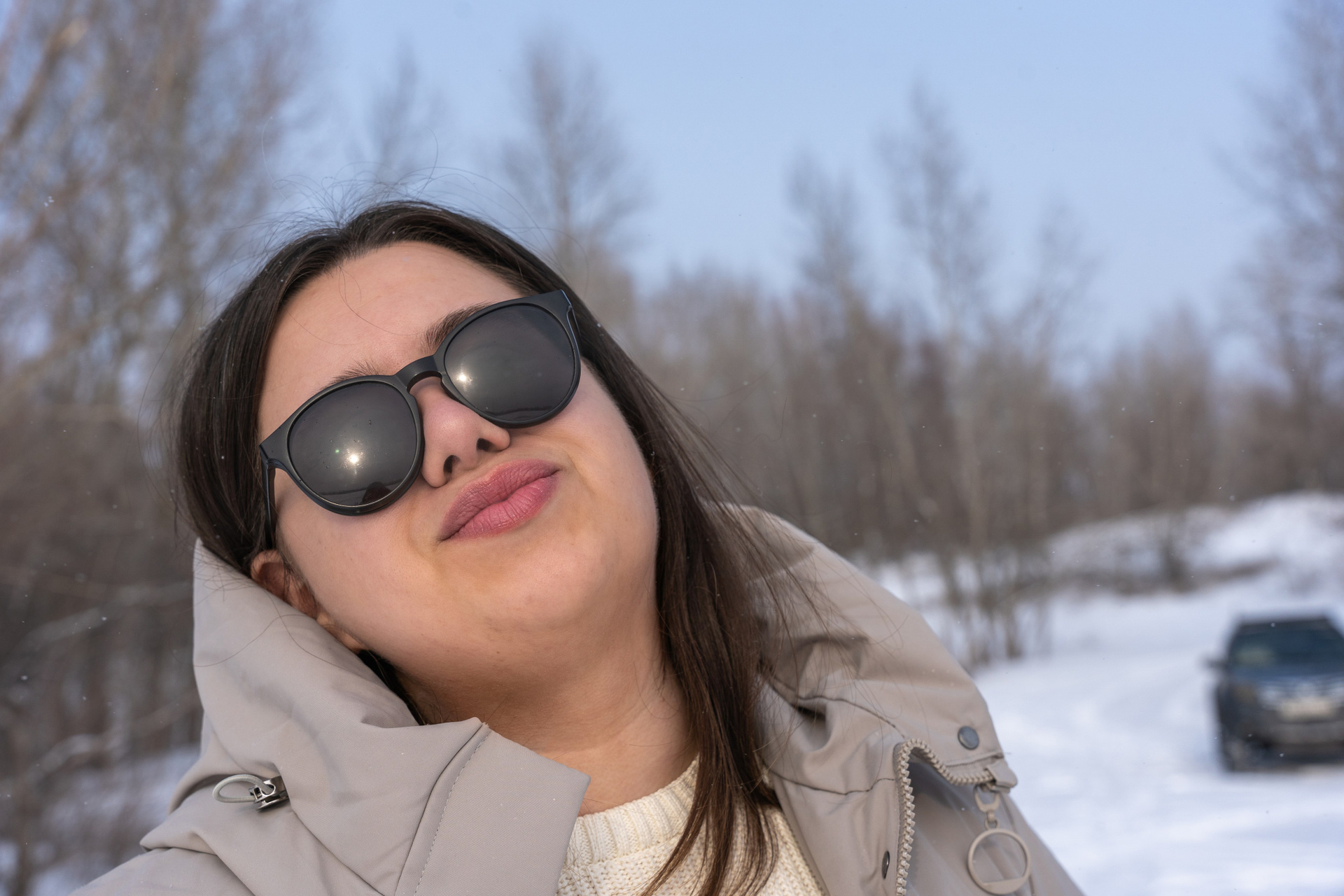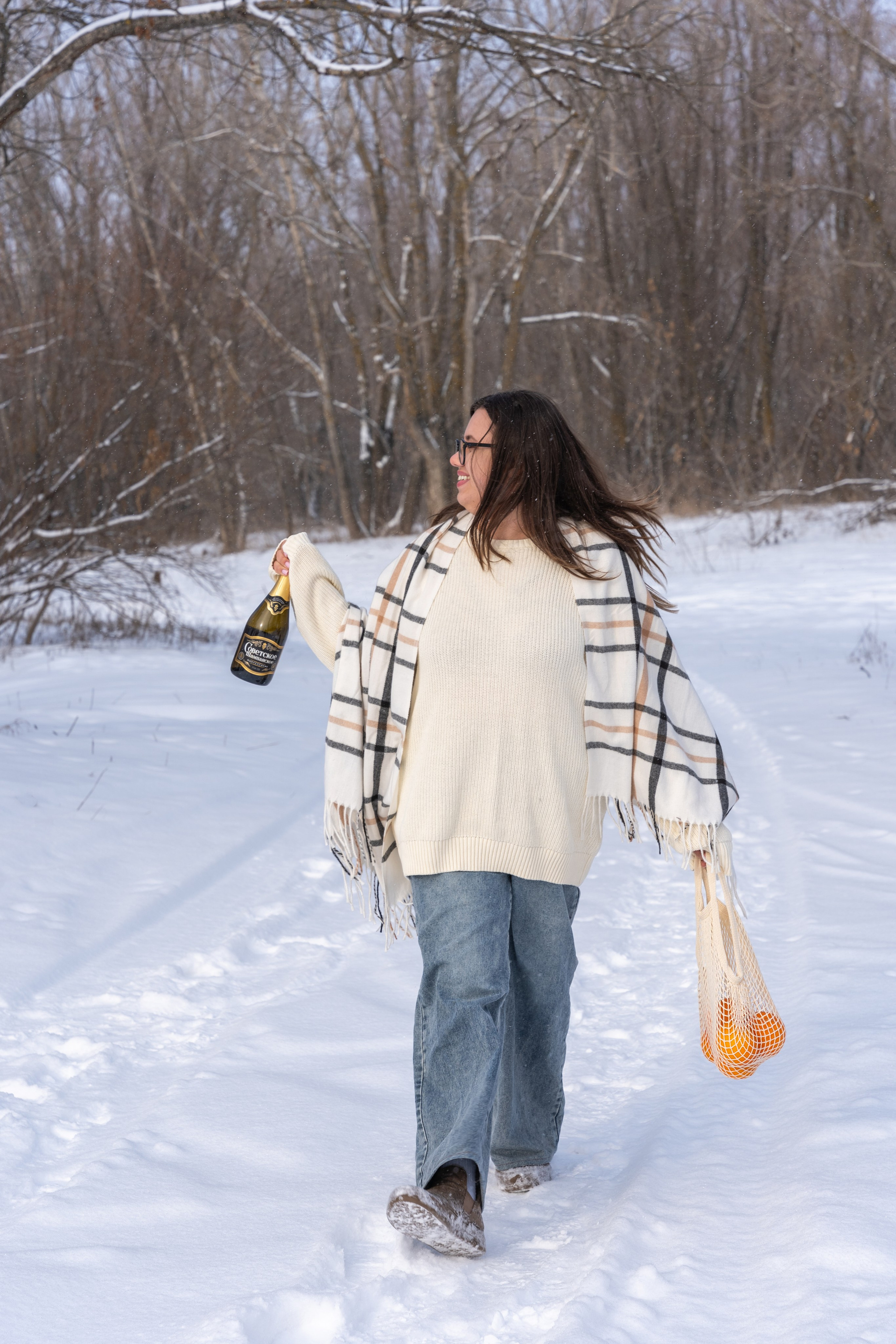 Мы снимали два образа в живописной зимней локации, где снег и деревья создавали волшебную атмосферу. Чтобы не замерзнуть, каждые 10 минут мы грелись в машине, но это не помешало нам получить много красивых и искренних кадров.