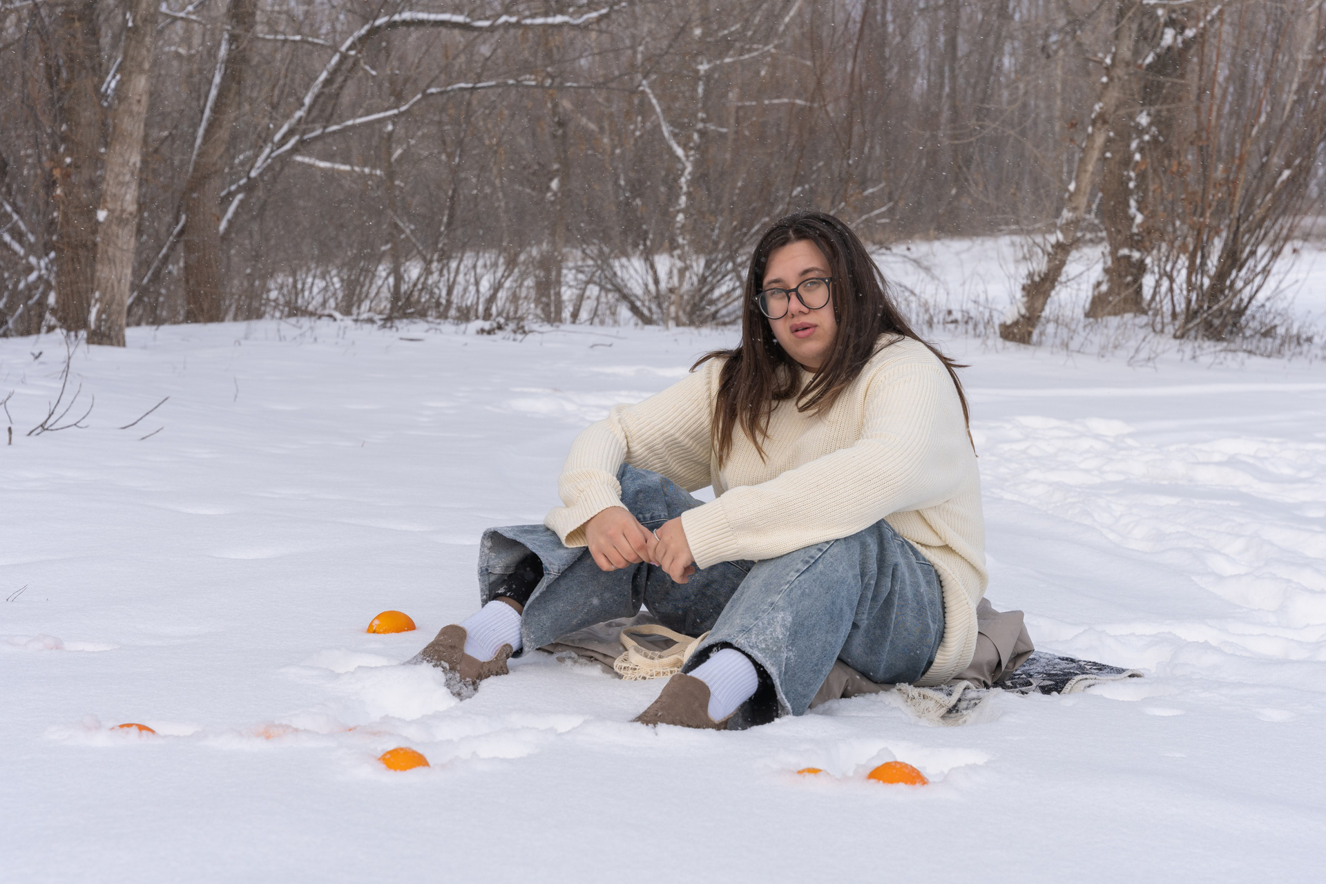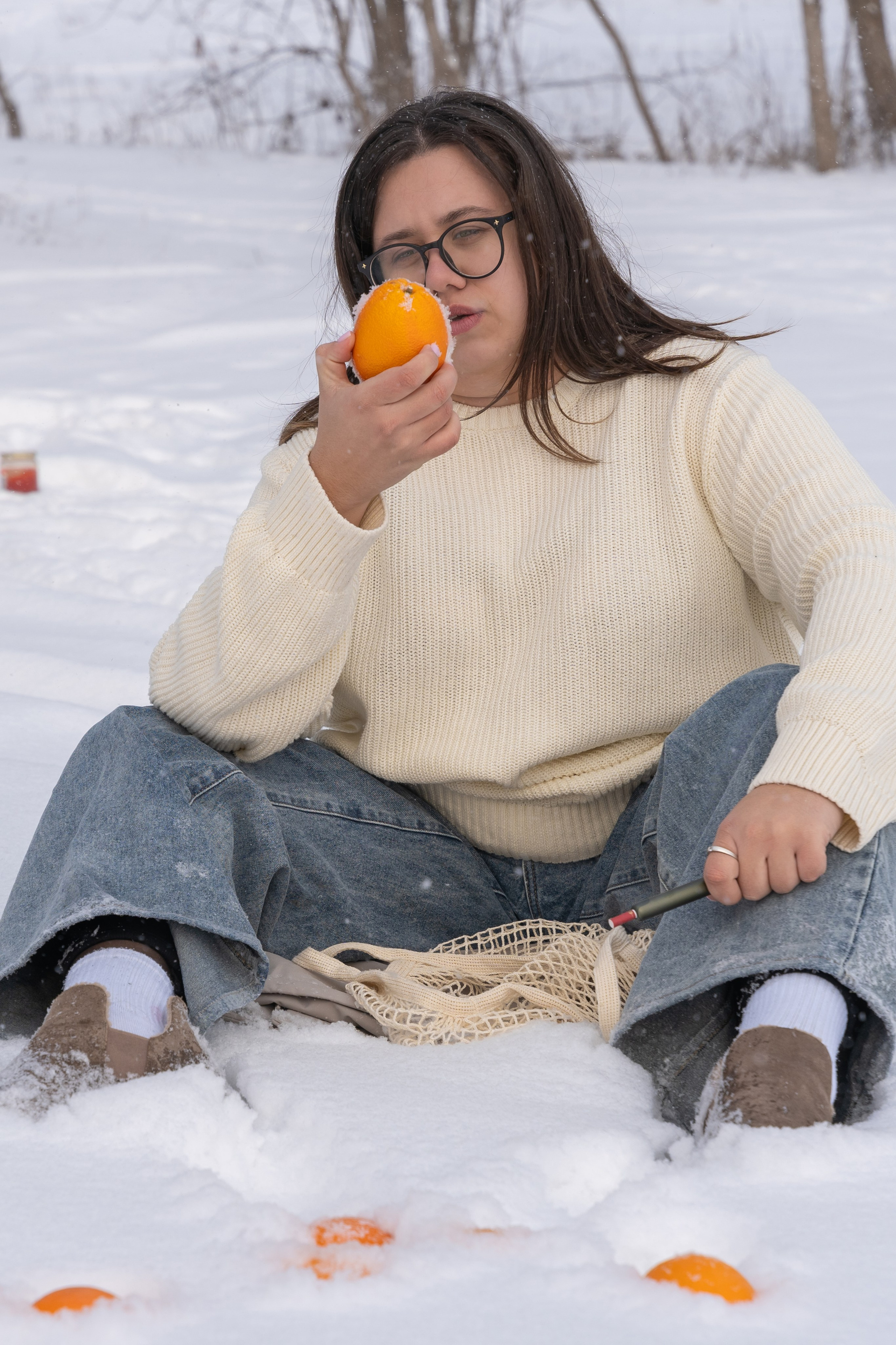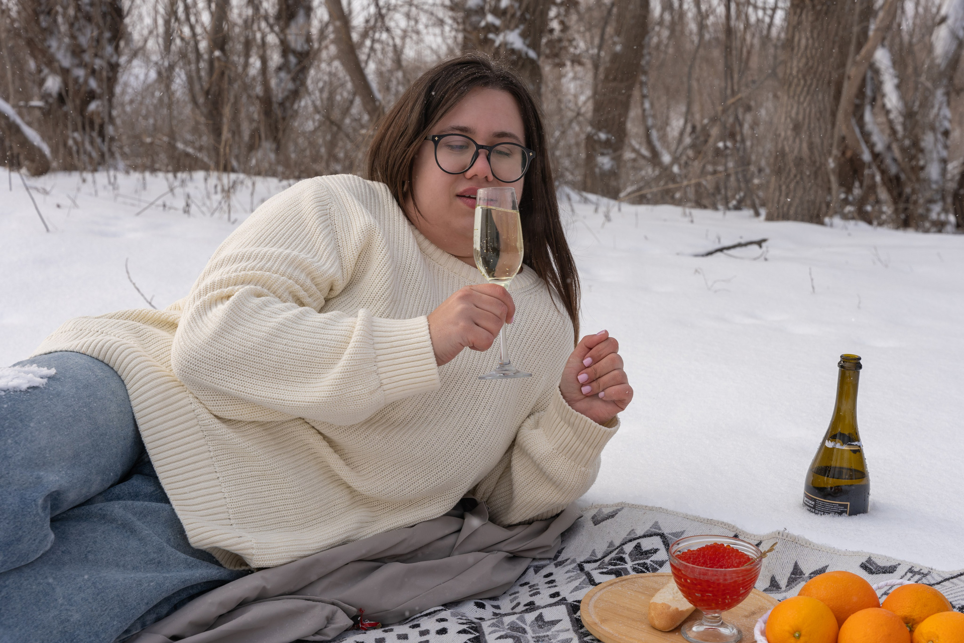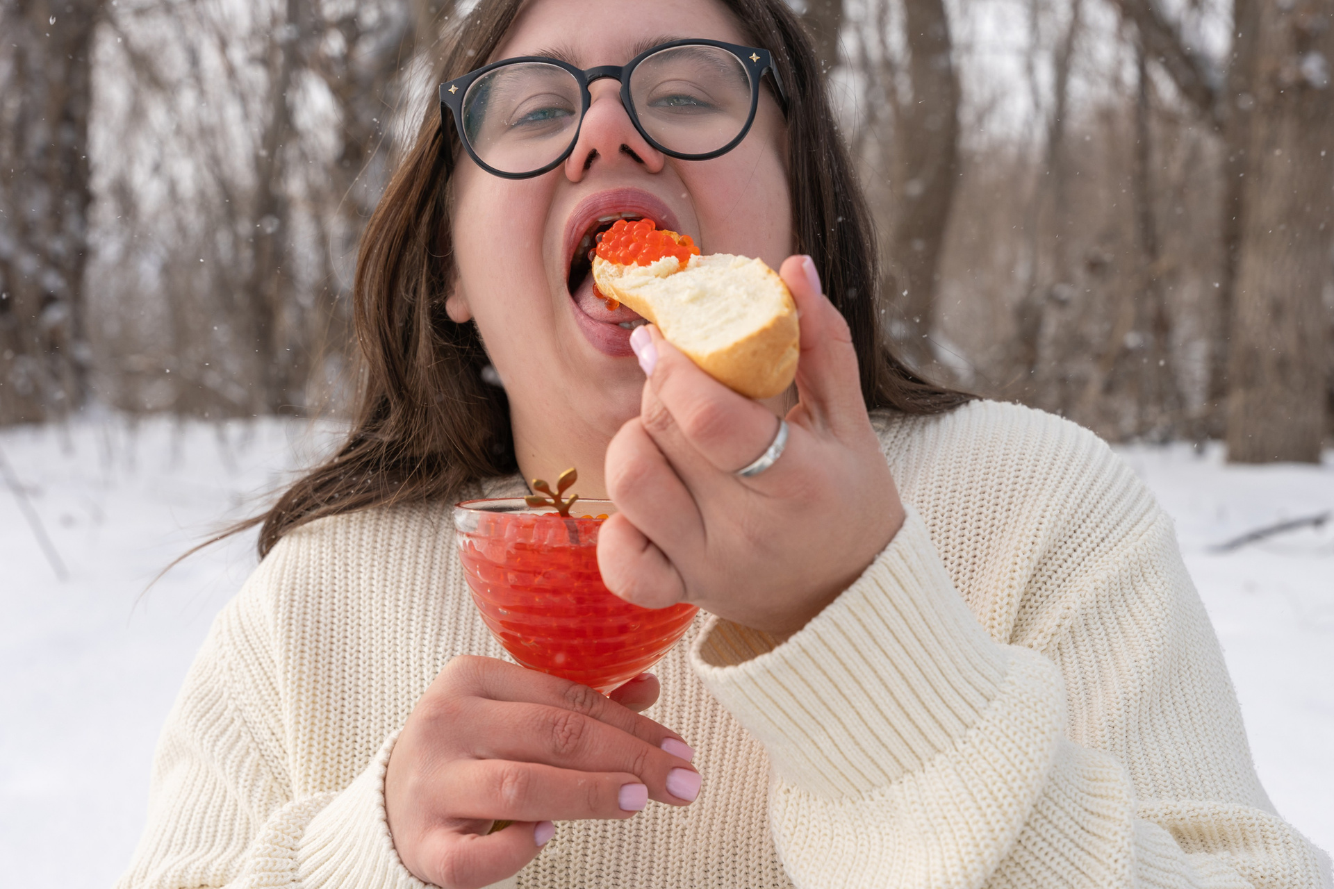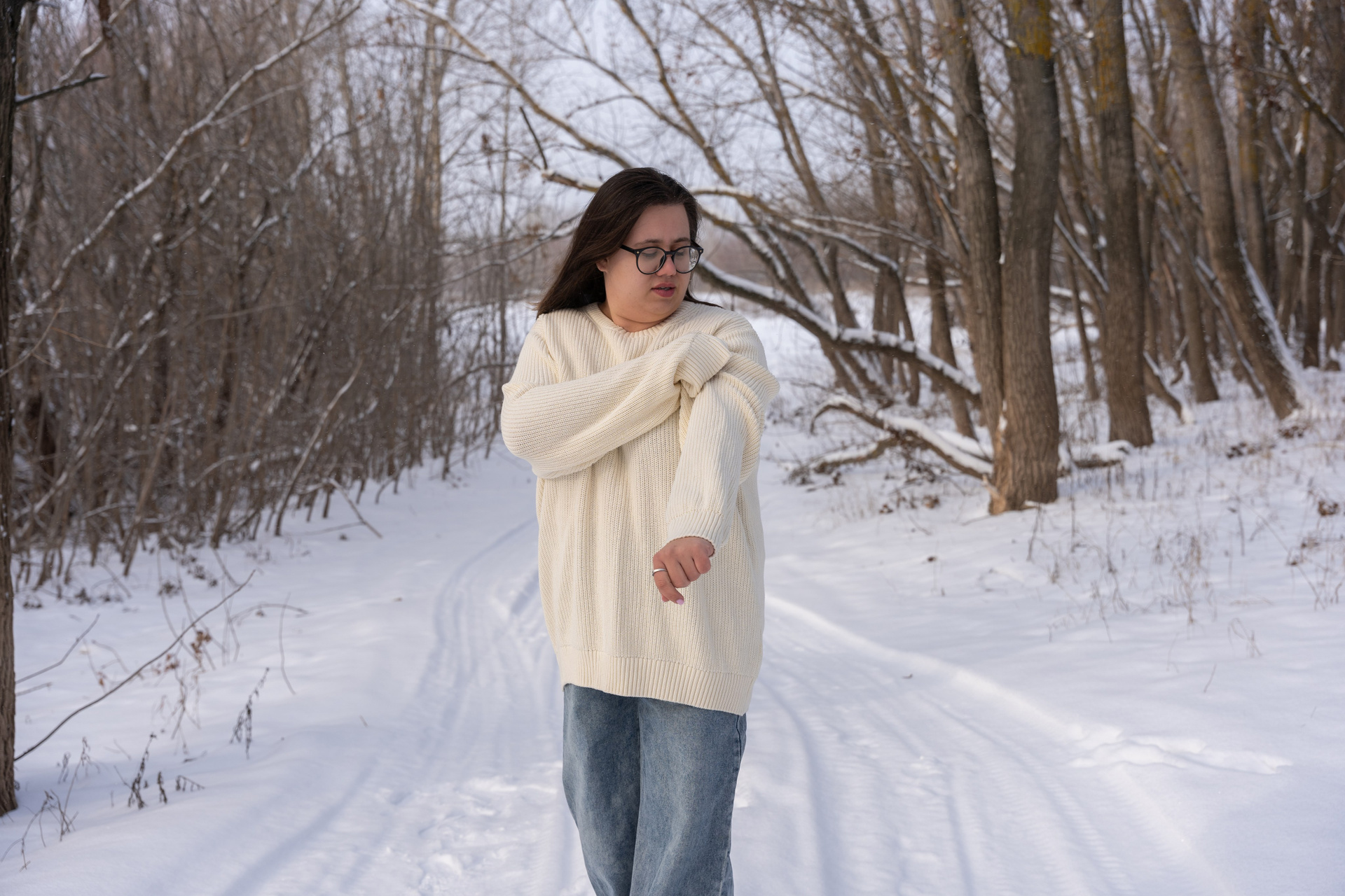 Мы снимали два образа в живописной зимней локации, где снег и деревья создавали волшебную атмосферу. Чтобы не замерзнуть, каждые 10 минут мы грелись в машине, но это не помешало нам получить много красивых и искренних кадров.