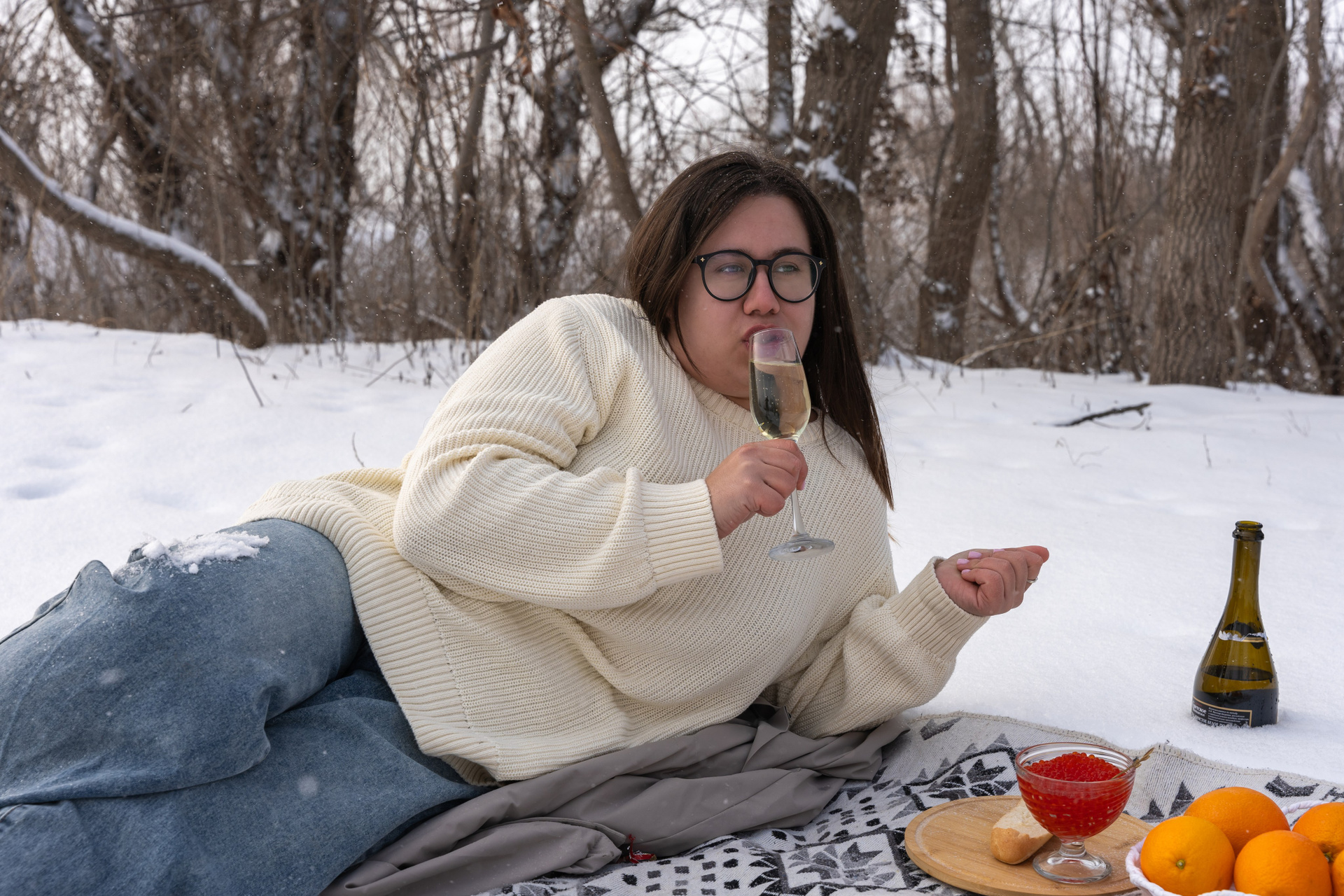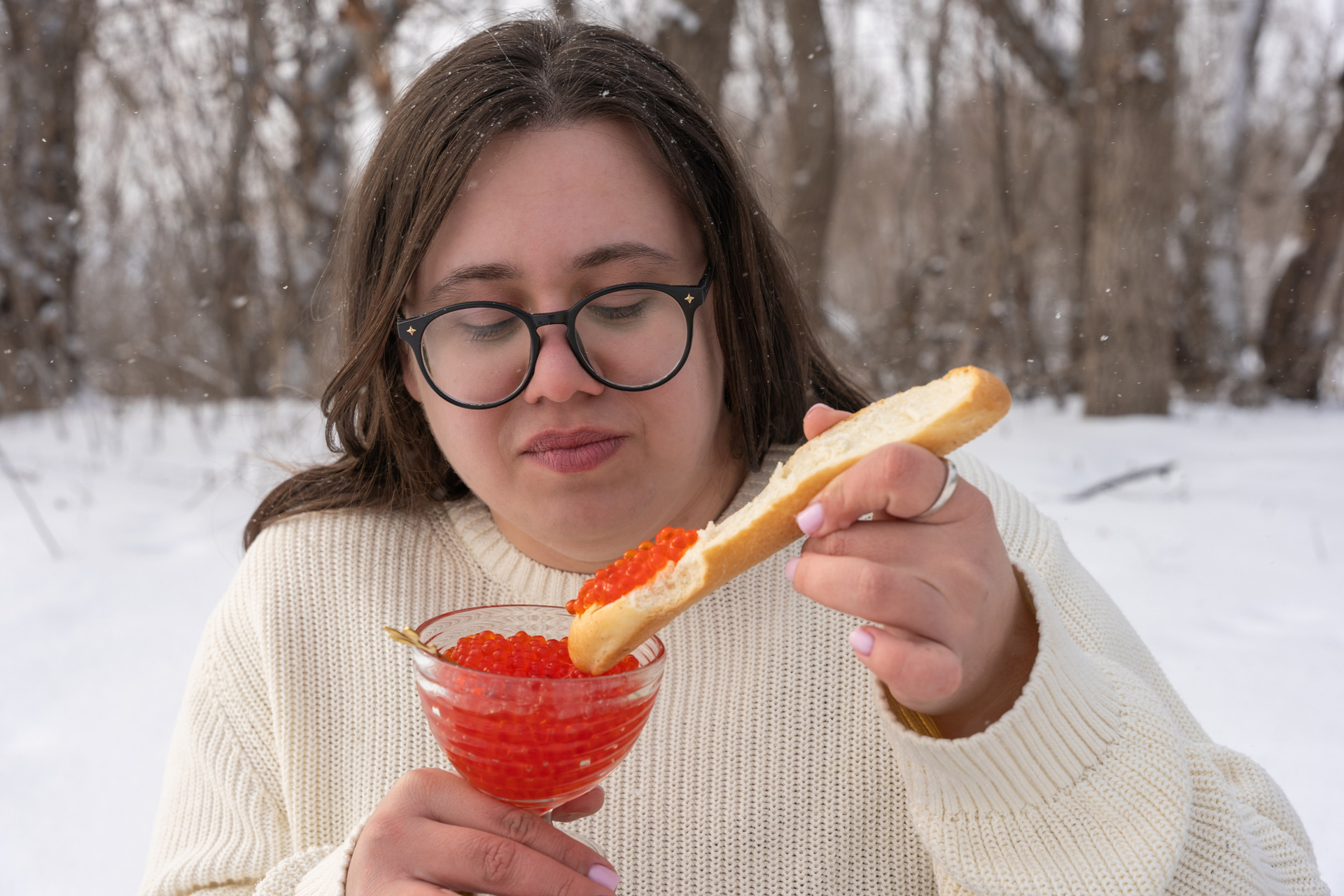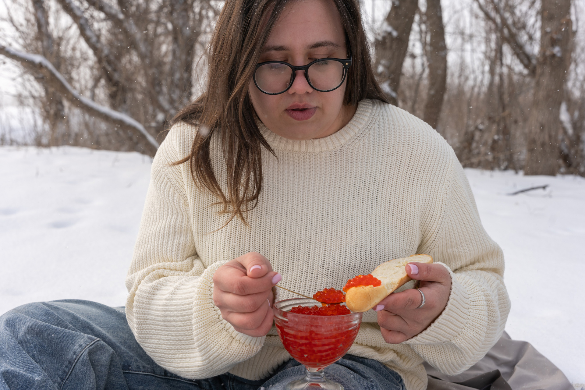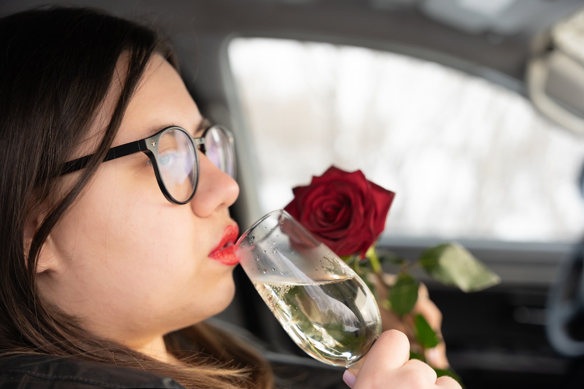Мы снимали два образа в живописной зимней локации, где снег и деревья создавали волшебную атмосферу. Чтобы не замерзнуть, каждые 10 минут мы грелись в машине, но это не помешало нам получить много красивых и искренних кадров.
